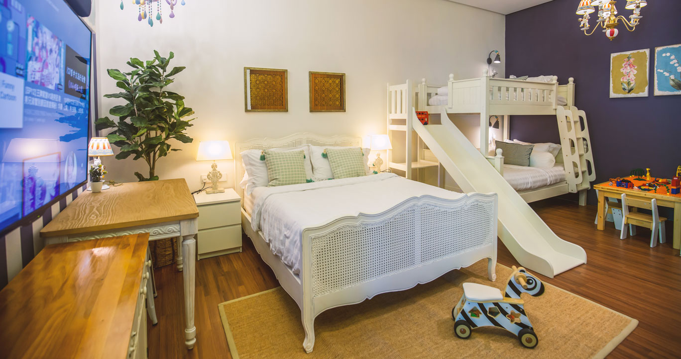 Grand Residence Suite is the biggest room consisting of 1 king-sized bed, 2 super-single beds and 2 toddlers' beds in different compartments in the room. The room is equipped with an open reading area which is specially designed for family bonding time - the space is all yours! Little ones can enjoy playing colorful building block pieces and parents can enjoy the view of the outdoor playground amidst the limestone hill scenery.