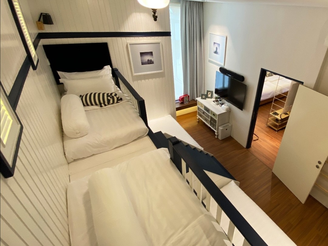 Sailor Suite consists of 1 queen beds and 2 single beds, and is divided into 2 sections for adults and children separately. The room comes equipped with a building block table for children to enjoy during the stay. This is a connecting room that leads you directly to the Woodland Suite. Let your dreams set sail here!